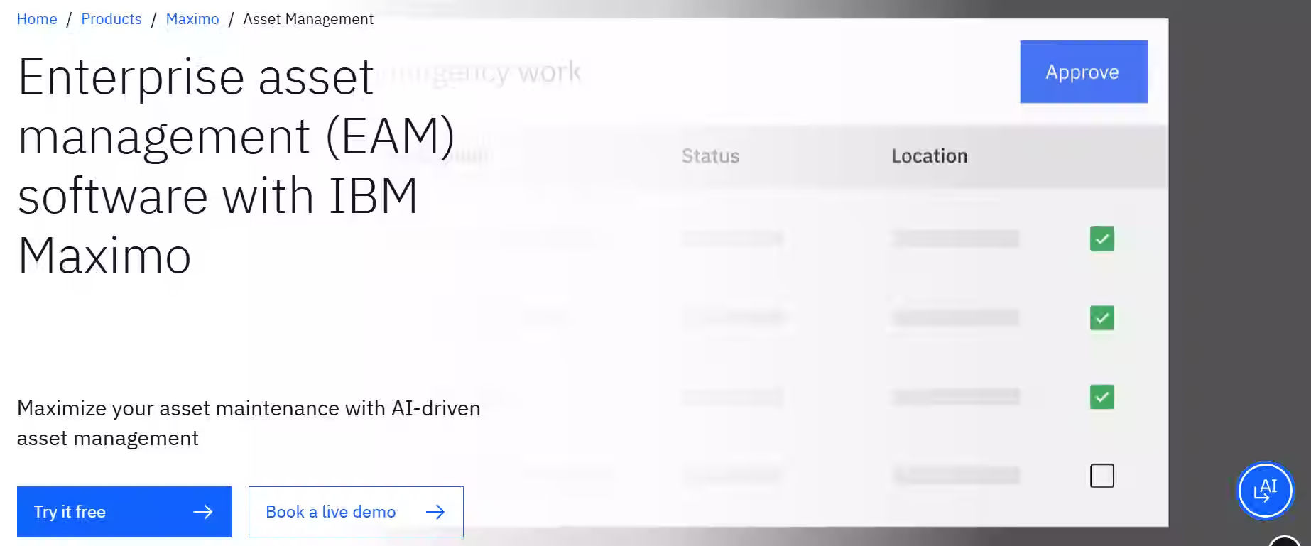 IBM Maximo is a leading enterprise asset management (EAM) platform designed for large organizations with complex physical environments. It helps teams manage assets, maintenance, and operations across industries like manufacturing, utilities, transportation, and oil & gas, all from a unified system.