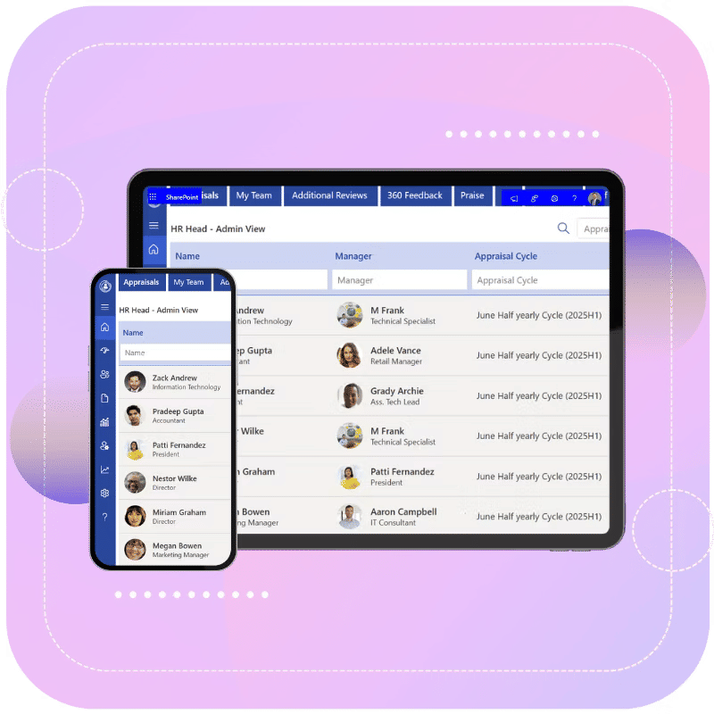 Yes. This Microsoft Performance 365 solution integrates with Microsoft 365 tools (SharePoint, Teams, Outlook), so performance management happens within the environment your team already uses no need for separate logins or extra tools.